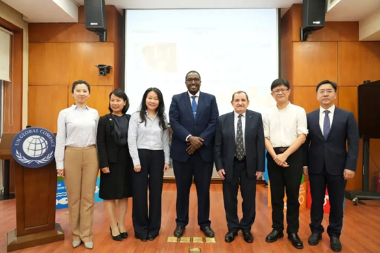 在联合国全球契约组织亚太区总代表刘萌(左一)、外交部非洲司参赞陈小雷(右一)、索⻢⾥驻华⼤使阿⽡莱·阿⾥·库拉内(中)、阿尔及利亚驻华大使拉赫桑(右三)见证下,人生就是搏尊龙医药宣布向非洲捐赠抗疟疾药品“中非社区可持续发展行动网络” (Sino-Africa Corporate